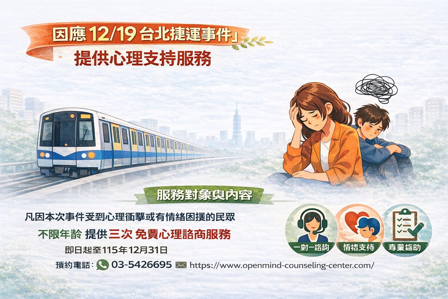 有些令人難以想像的事件總會猝不及防的闖進平靜的生活,或無預警的透過媒體影入眼簾,讓人不安甚至心生恐懼,如果您也因為「12/19 台北捷運事件」出現不安、焦慮或失眠、、、等壓力症狀,本所配合中央政策,提供受事件心理衝擊之民眾心理支持服務: