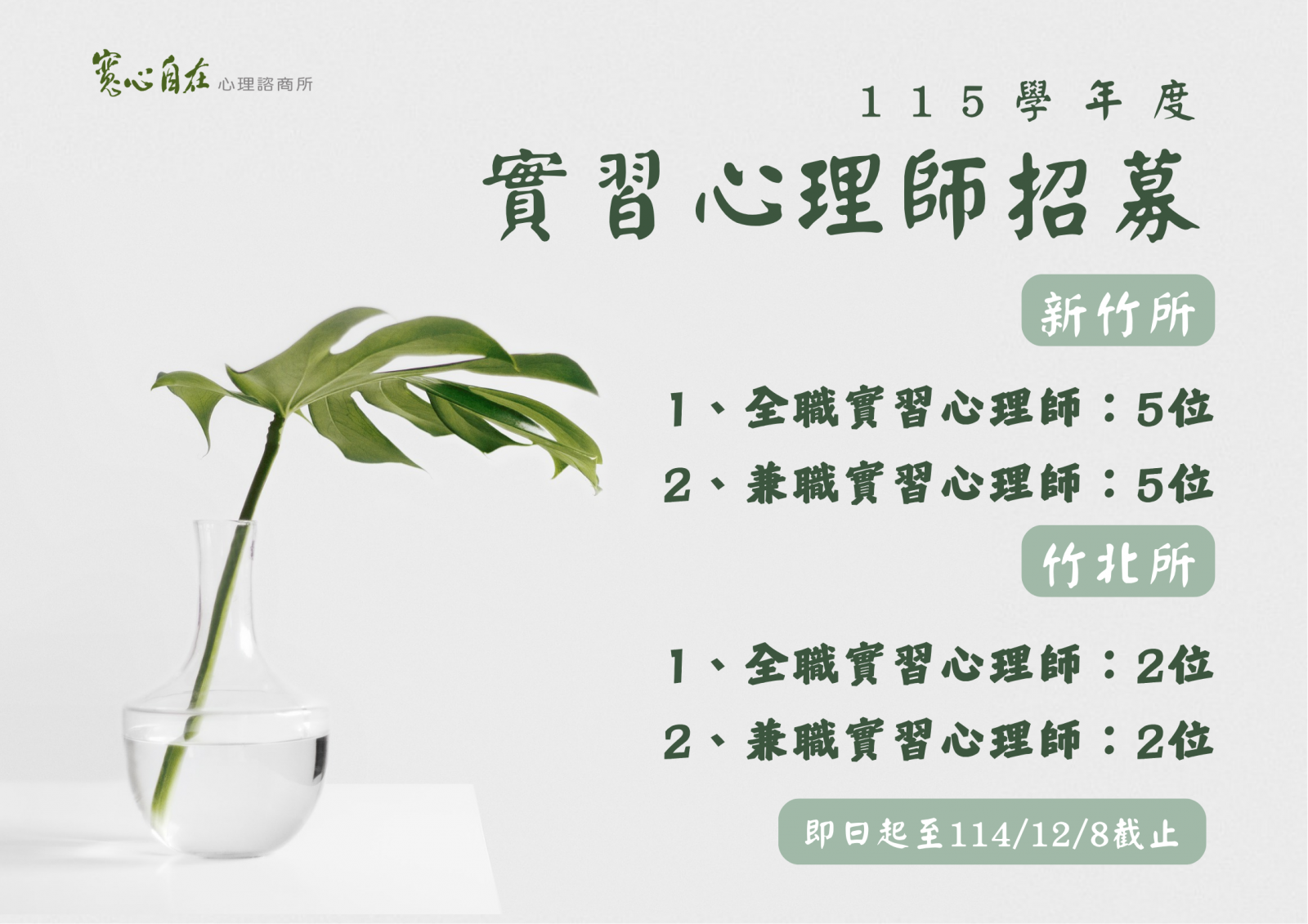 寬心自在心理諮商所深耕社區心理諮商近15年,長期致力於社區心理健康專業諮商人才儲訓,不但提供優質的實務學習的硬體環境(實習心理師有專用的接案空間),同時透過高品質完整的實習訓練系統、提供實習心理師專業督導、個案研討、專業訓練、、、等,我們有計劃的培訓實習心理師,目的在培育適合社區心理諮商的專業人才,實習心理師在諮商所完成兼職與全職實習課程後,經評審合格可以加入寬心自在心理諮商所合作心理師的工作行列。